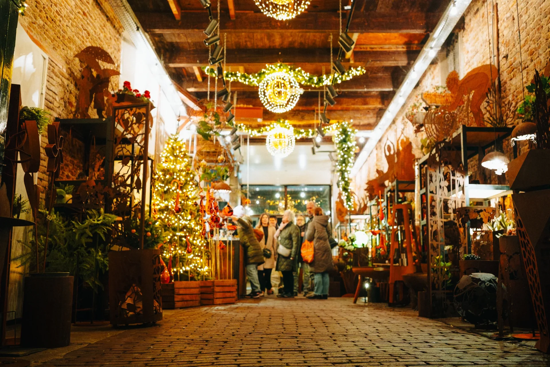 Gezellige kerstmarkt met toneelspelers, zangkoren, vuurkorven, glühwein en kramen.